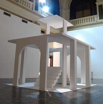"Um espaço lúdico, simbólico, uma construção sem função. Essa “máquina de morar” não funciona, apenas ri. Uma escada que não leva a lugar algum. Ironia. Na arquitetura moderna “a forma segue a função”, correta, funcional, um estilo correspondente às