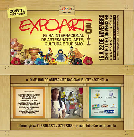 Artistas, artesãos e manifestações culturais têm encontro marcado na Feira Expoart – Feira Internacional de Artesanato, Arte, Cultura e Turismo, que acontece de 15 a 22 de novembro, no Centro de Convenções da Bahia. O evento, que está em sua segunda edição, vai contar com exposições, performances e apresentações de artistas da Bahia, de todo o Brasil e de outros países, como Itália, Rússia, Espanha, Croácia, França, Portugal, Eslovênia, Marrocos e Alemanha. O objetivo da Feira Expoart é trazer novidades do mercado do artesanato, da arte, da cultura e do turismo nacional, buscando cada vez mais a interação, a troca de técnicas e informações entre os profissionais dessas áreas. A Expoart 2011 vai reunir 150 expositores, com expectativa de receber um público de 30 mil pessoas durante o evento.