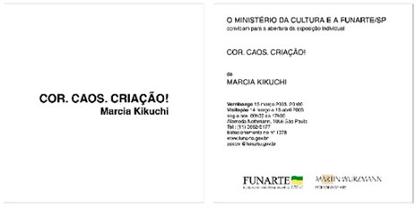 A exposição “Cor. Caos. Criação!” da artista plástica Marcia Kikuchi preparada pela Funarte com Curadoria de Roberto Bicelli, traz 15 trabalhos inéditos e mostra o atual estágio de desenvolvimento de sua obra: essencialmente abstrata, com influência do Movimento Abstração-Criação fundado em Paris nos anos 30. Em seu currículo, uma série de exposições coletivas e individuais, sendo a última a individual na Maison du Brésil, Paris, em setembro do ano passado. As telas da artista estarão expostas de 13 de março a 13 de abril de 2003 na Galeria Mário Schenberg da Funarte.